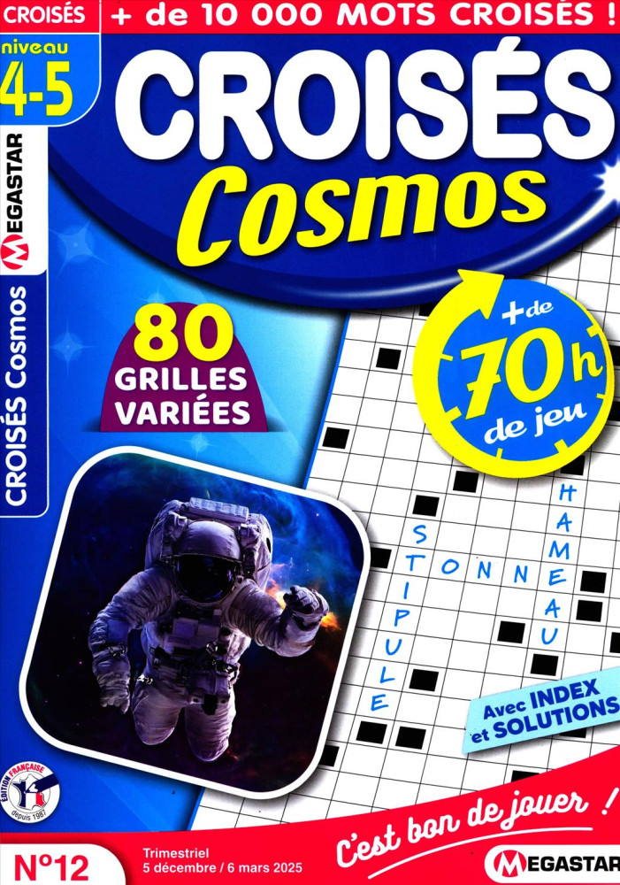 Notre nouveau magazine Croisés Cosmos niveau 4/5 est fait pour vous ! Ses définitions de niveau moyen et difficile, garanties par nos auteurs, et ses grilles de formats variés vous assureront des moments de jeu intenses et stimuleront votre réflexion. Son grand format et sa mise en page claire et lisible sont des atouts appréciables.