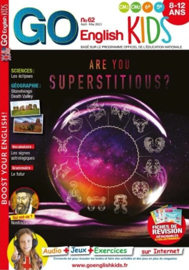 Go English Kids est un magazine bimestriel pour apprendre l'anglais, destiné aux enfants de 8 à 12 ans. Il complète la gamme Go English J'APPRENDS L'ANGLAIS, ENGLISH NOW, GO ENGLISH. Basé sur le programme officiel de l'éducation nationale, il s'adresse aux enfants qui veulent approfondir les cours de l'école tout en s'amusant. Ils y trouveront une BD, des jeux et exercices en plus d'articles sur la culture anglophone. Un code d'accès indiqué au sommaire leur permettra d'accéder à l'audio et à d'autres jeux et exercices interactifs sur internet.