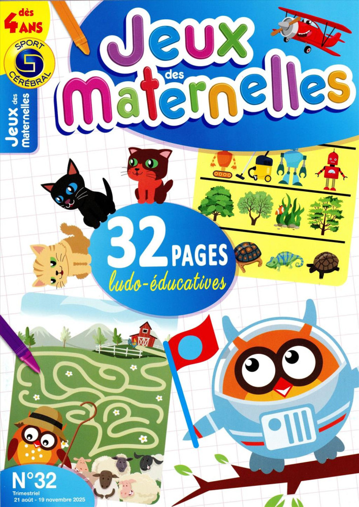 Dès 4 ans. Le multijeux des tout-petits !Chouette, une nouvelle revue pour les petits bouts ! Elle s'appelle Jeux des Maternelles et avec elle, votre enfant va s'amuser comme un petit fou. S'il aime dessiner, il va pouvoir réaliser de beaux points à relier et des coloriages. Il pourra s'adonner au jeu de l'intrus, chercher les différences ou retrouver son chemin dans un labyrinthe. Autant d'activités ludiques qui favoriseront son éveil ! Taillez ses crayons et installez-le confortablement, plein de surprises l'attendent.