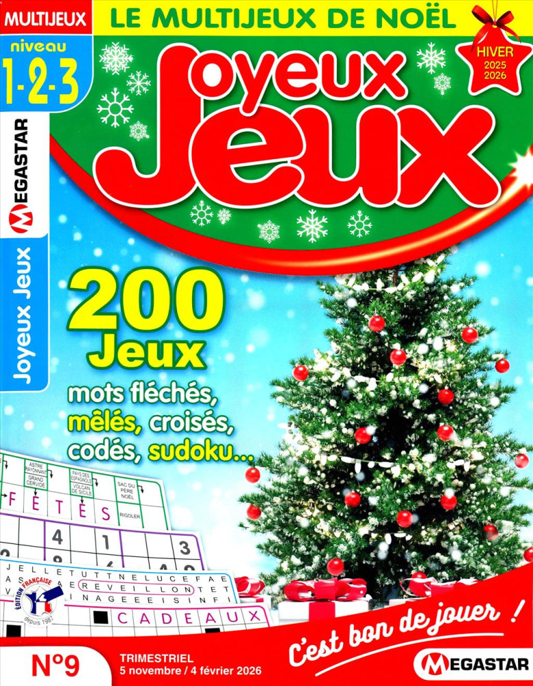Faites le plein de jeux avec Joyeux Jeux ! Que vous soyez fan de jeux de lettres ou jeux de chiffres...il y en aura pour tous les goûts et pour tous avec ses niveaux de 1 à 3. N'attendez plus pour vous amuser et vous détendre : grilles de mots fléchés, mots mêlés, sudoku, mots codés, mots casés, crypto...vous aurez l'embarras du choix !